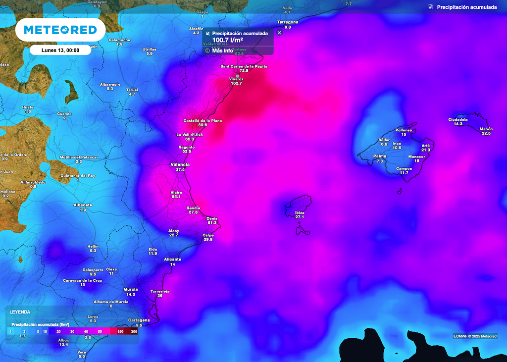 Los modelos mesoescalares prevén entre hoy y mañana acumulados de precipitación de entre 100 y 200 l/m2 en el litoral y prelitoral de estas zonas, que caerán en menos de dos días con el riesgo de crecidas que pueden suponer. En las comarcas de la Ribera Baja y La Safor se prevén incluso algunos litros más. Sin ser cifras comparables a las de hace un año, los vecinos de la Comunidad Valenciana deben tomar precauciones y permanecer atentos a los avisos oficiales.