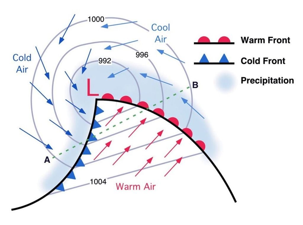 La formación del frente frío y del cálido en torno a una borrasca polar, es consecuencia directa del mencionado empuje provocado por una masa de aire de origen polar en su afán por descolgarse y bajar de latitud. La principal diferencia entre el frente frío y el cálido reside en el tipo de nubes y de precipitación asociada a cada uno de ellos. El paso de cada frente se manifiesta por un cambio en el estado del cielo y de las distintas variables meteorológicas.