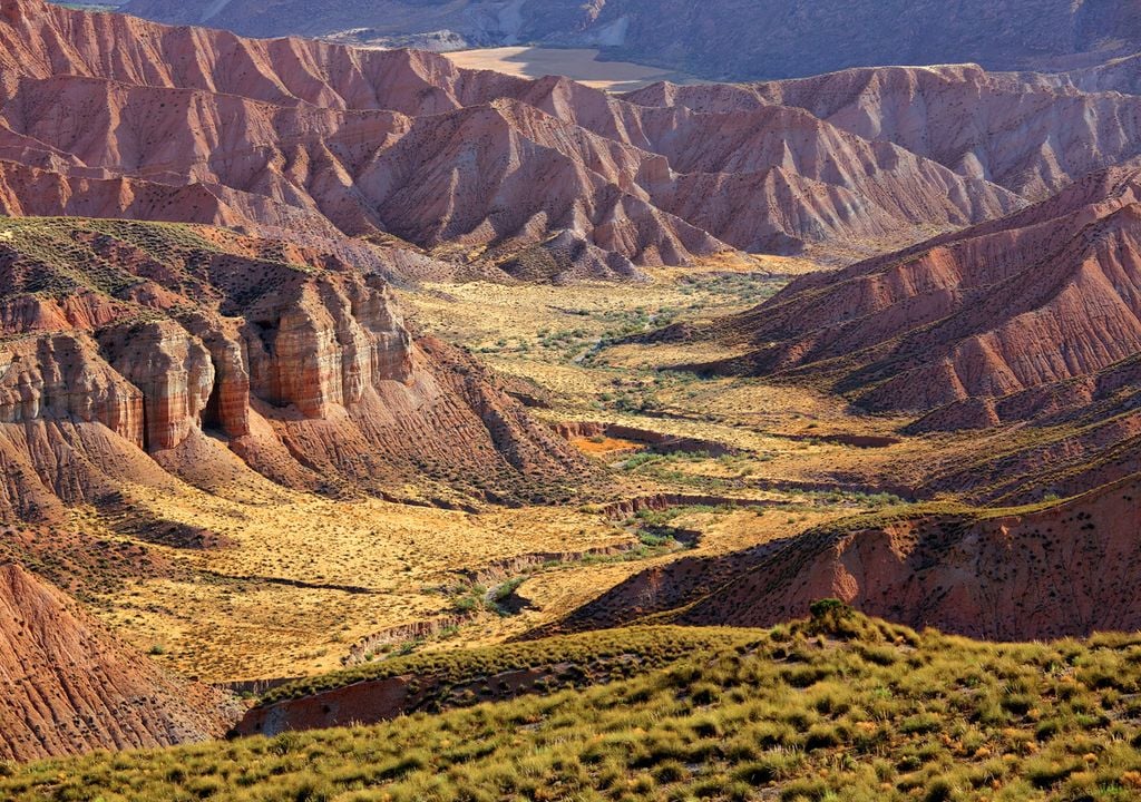 La erosión ha creado un relieve espectacular de cárcavas y cañones, especialmente visibles en municipios como Beas de Guadix. Desde el Mirador del Fin del Mundo, los visitantes pueden contemplar un mar de barrancos rojizos que se extienden hasta el horizonte, uno de los paisajes más impresionantes de Andalucía oriental.