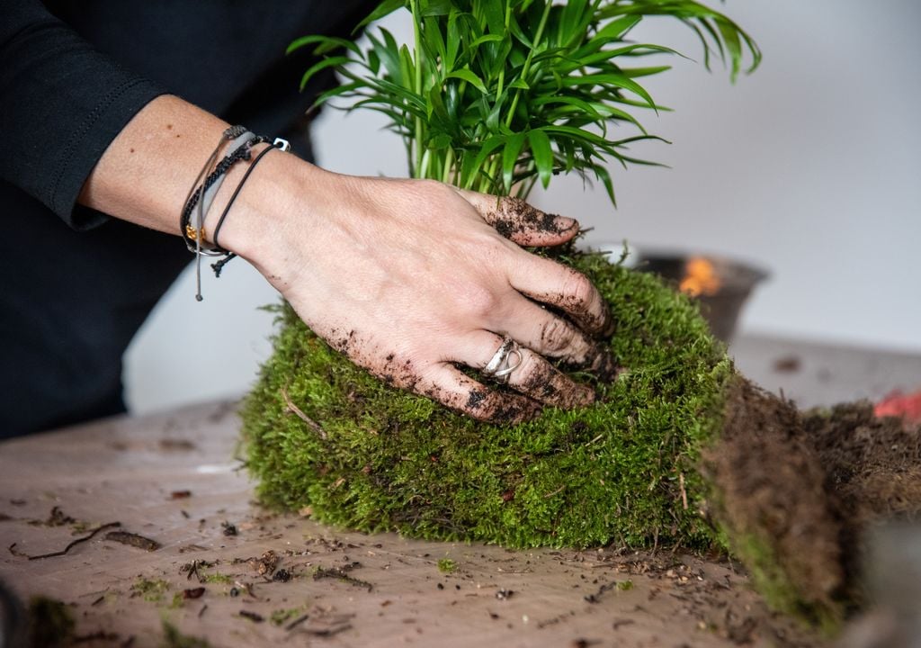 - Envuelve con el musgo: coloca el musgo alrededor de la esfera, cubriendo completamente la tierra. El musgo funciona como una piel natural que mantiene la humedad y da ese aspecto decorativo característico.