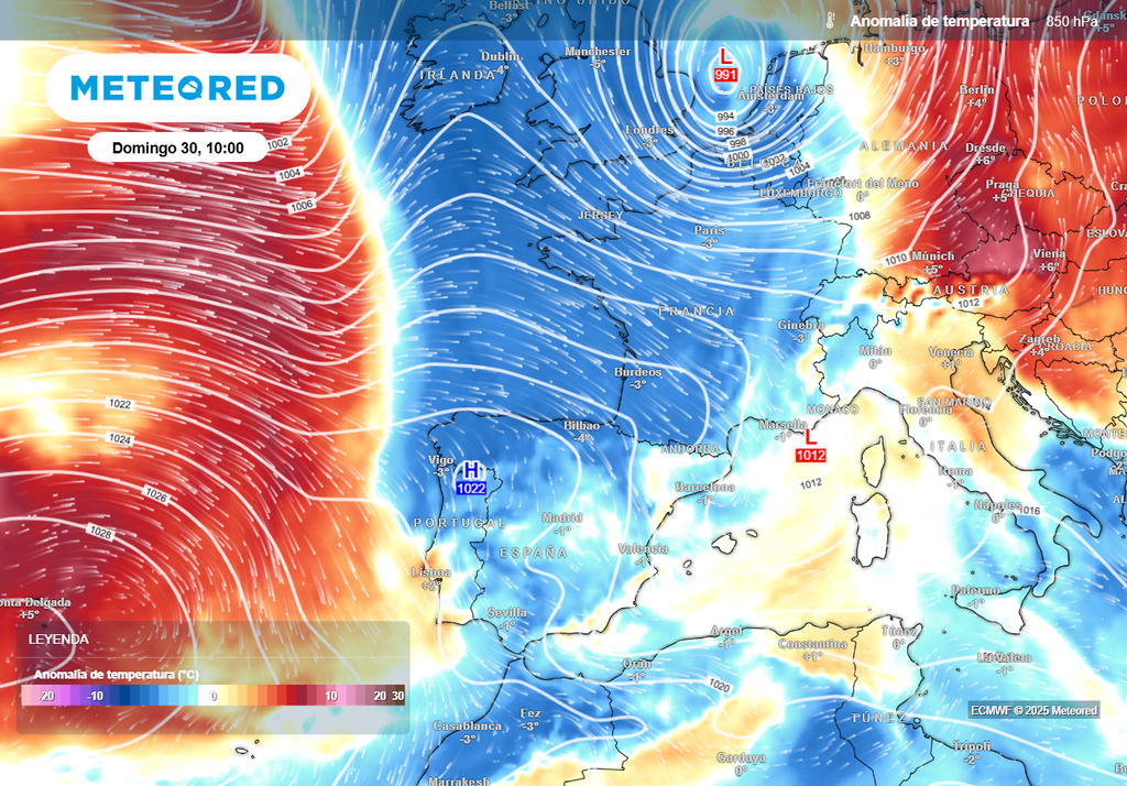 La vaguada se irá desplazando hacia el este y, en la jornada de mañana, ya dominarán condiciones propias de una dorsal anticiclónica, pues el chorro polar tenderá a fortalecerse y elevarse de latitud, permitiendo la entrada de aire más estable y templado. Esto se traducirá en un predominio de claros, un descenso claro de la inestabilidad y un repunte de las temperaturas diurnas.