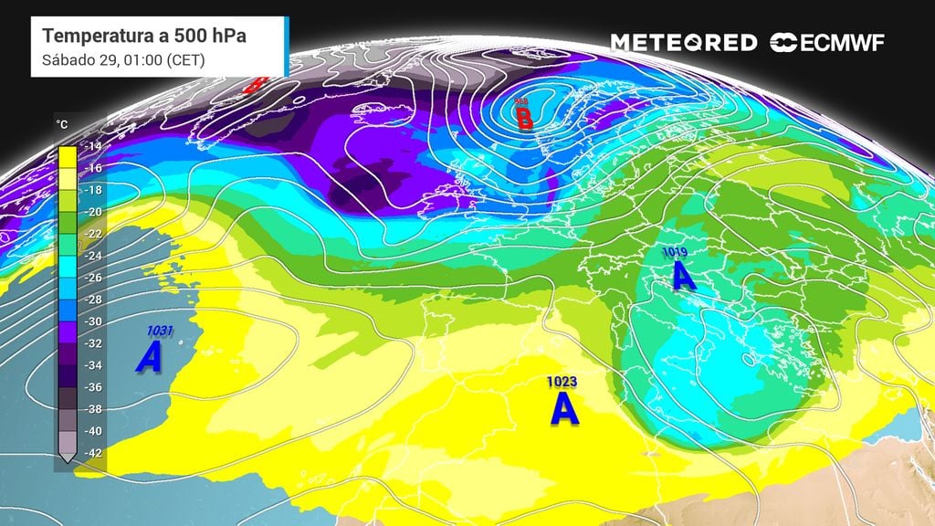 El domingo, ya con la onda sobre la vertical de la península, habrá un cambio significativo de tiempo según el modelo europeo, pues el mercurio se desplomará de forma generalizada y dejará mínimas por debajo de los 10 ºC en prácticamente toda la España peninsular.