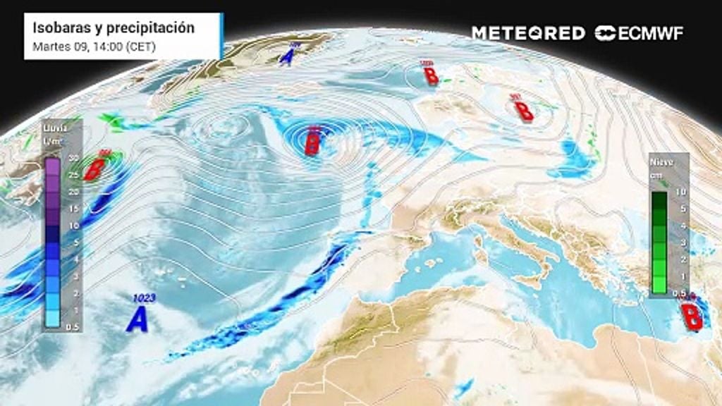 Como ya hemos comentado en Meteored, el modelo europeo nos muestra que para esta semana predominará un patrón de NAO +. Según este escenario, las borrascas atlánticas circularán en latitudes más altas pero un debilitado anticiclón de las Azores dará paso a un sistema frontal que dejará precipitaciones en la mitad occidental peninsular.