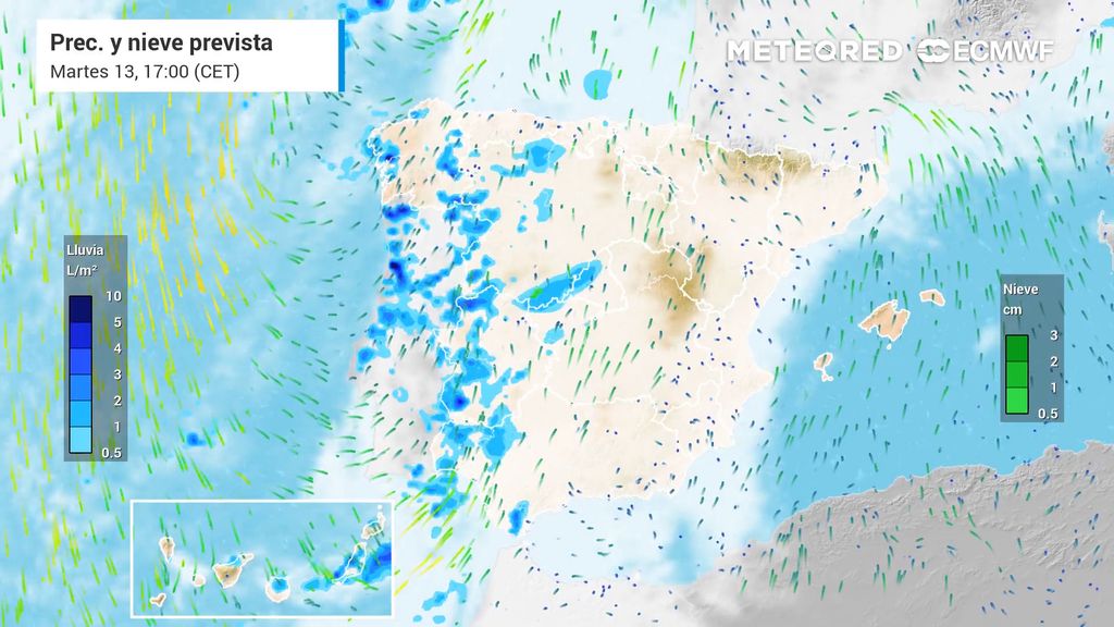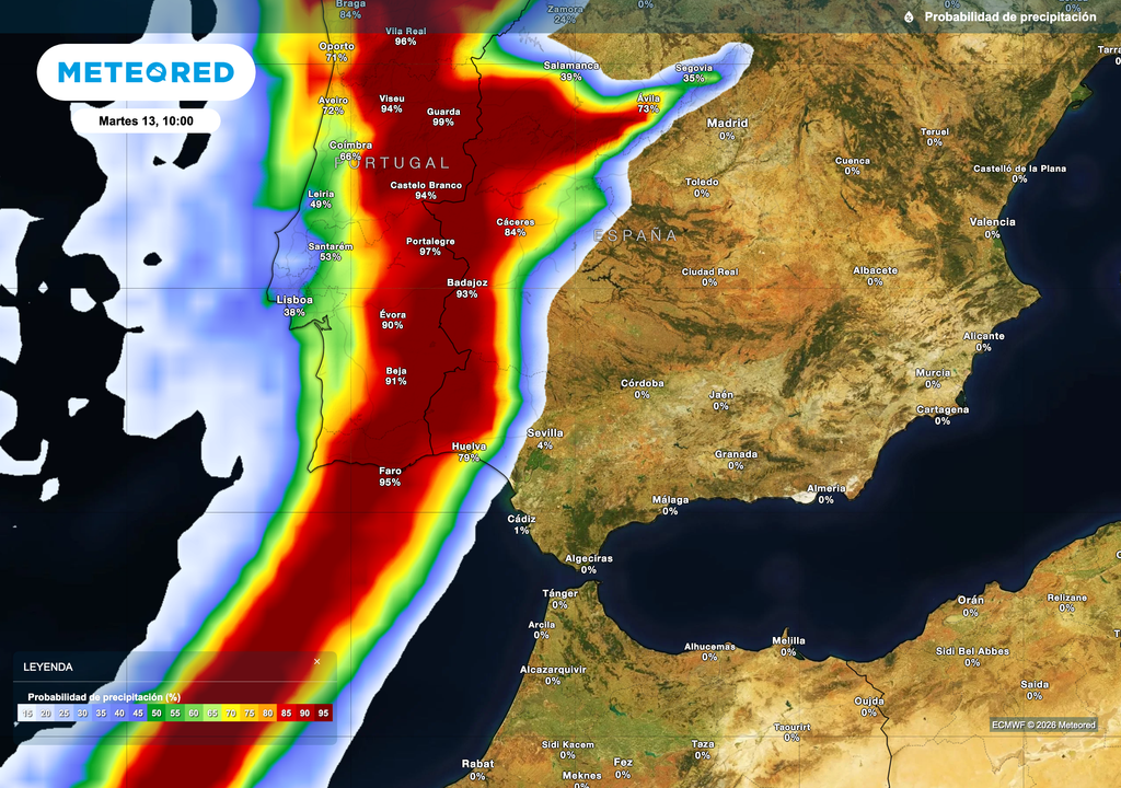 El frente irá acompañado de un río atmosférico, canalizado al sur del anticiclón de las Azores, transportando vapor de agua procedente de latitudes subtropicales. Sobre la hora del almuerzo, el río atmosférico apuntará directamente hacia el Golfo de Cádiz, potenciando las lluvias en zonas orográficas expuestas a los vientos de suroeste.