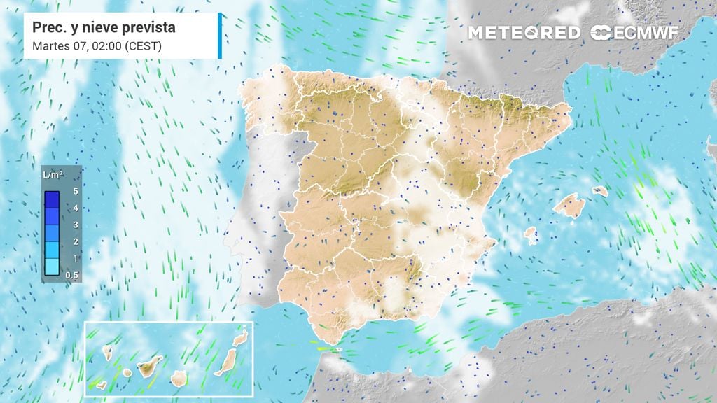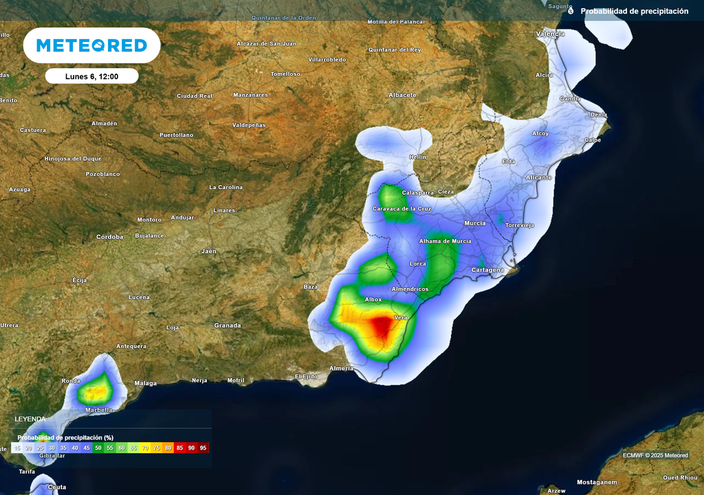 Aunque la mayoría de los modelos prevén acumulados discretos, algunos escenarios de alta resolución apuntan a que, en zonas concretas del sureste peninsular, como el este de Murcia, sur de Alicante y buena parte de Almería, podrían darse chubascos más intensos y generalizados.