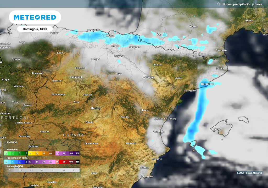 Aparte de las precipitaciones del extremo norte peninsular, asociadas al paso de la cola del frente asociado a la borrasca Amy, las precipitaciones mediterráneas aparecerán durante la primera mitad de hoy por el noreste peninsular, especialmente en el este de Cataluña, el entorno del Cabo de la Nao y el oeste del archipiélago balear. Serán lluvias en general débiles y dispersas, aunque puntualmente moderadas.