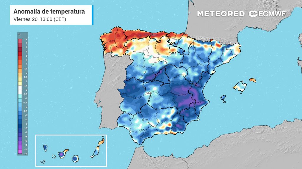La llegada de una masa de aire frío dará paso a que las temperaturas se posicionen por debajo de la media en buena parte del territorio. De cara a mañana, las anomalías serán más pronunciadas y más extensas.