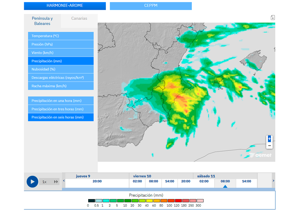 Hasta la tarde seguirán entrando núcleos tormentosos de mar a tierra principalmente en la Comunidad Valenciana y Región de Murcia, con acumulados que en una hora pueden sobrepasar localmente los 40 l/m², según nuestro modelo de referencia. Las lluvias también caerán en el sur de Cataluña, sur de Andalucía, comarcas meridionales de Teruel y este de Castilla- La Mancha, pero en principio no serán tan intensas.