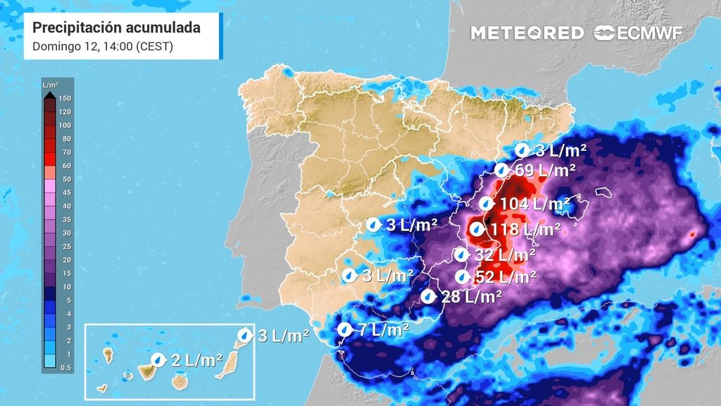 Se trata de una situación clásica de lluvias abundantes y localmente intensas en el este peninsular y Baleares. El anticiclón de las islas británicas está impulsando vientos de levante de largo recorrido marítimo sobre un Mediterráneo aún cálido, mientras que el desplazamiento retrógado de la vaguada aporta aire frío en altura. Esta combinación dispara el desarrollo de nubes convectivas.