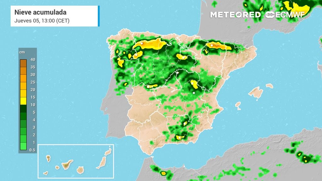 Hay que destacar que la cota de nieve se disparará al final del día hasta los 2000 metros en la mayor parte del territorio por la entrada de aire subtropical, manteniéndose en torno a los 1500 m en el noreste. En áreas elevadas de la Cordillera Cantábrica, el Sistema Central, el Sistema Ibérico y el Pirineo, los acumulados seguirán aumentando y podrían superar los 30–50 cm, con valores localmente mayores en cotas altas.