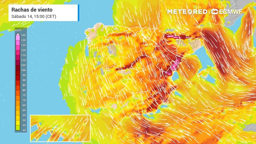 El sábado concentrará el momento más adverso del episodio en el este peninsular, con un flujo dominante de componente noroeste que se intensificará claramente entre el mediodía y la tarde. La orografía volverá a jugar un papel clave, canalizando el viento y disparando las rachas en zonas expuestas.