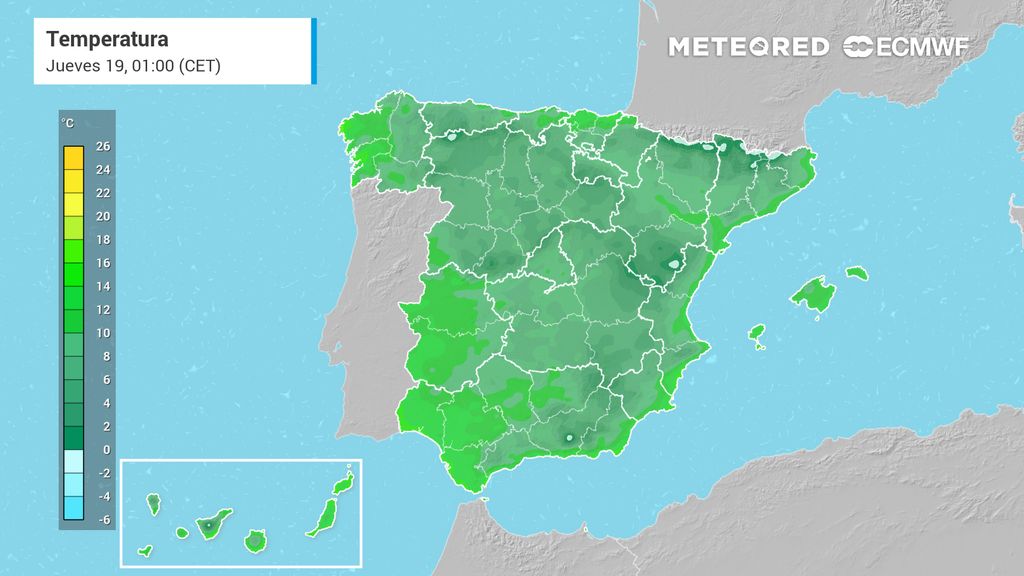 El jueves este bajón será aún más acusado en la Comunidad Valenciana, Cataluña y Pirineos, donde las máximas pueden ser hasta 8 ºC más bajas respecto a las de mañana miércoles. En zonas de Canarias bajarán 4-6 ºC este día por el paso de un frente muy activo.