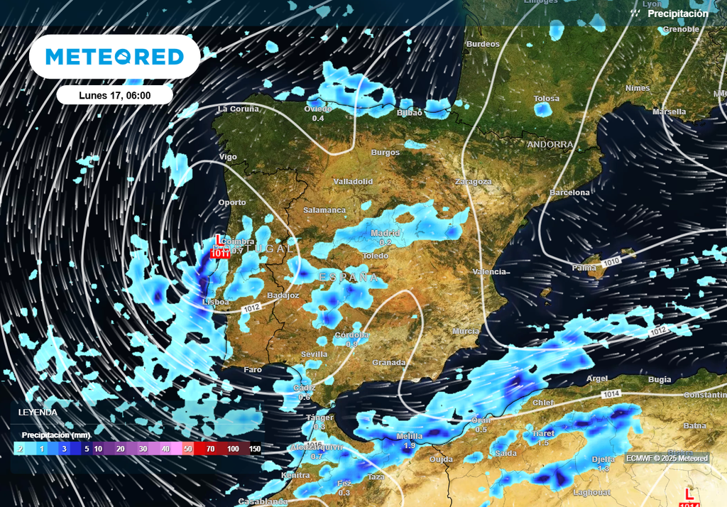 Entre el lunes y el martes una vaguada con los restos de Claudia cruzará la España peninsular y Baleares, repartiendo chubascos y tormentas, que no descartamos que sean localmente intensos en el entorno del golfo de Cádiz y en el archipiélago balear. El lunes el flujo de norte dejará precipitaciones en el norte de Galicia, vertiente cantábrica, Ibérico norte y en la divisoria-vertiente francesa del Pirineo. Nevará en las principales cordilleras.