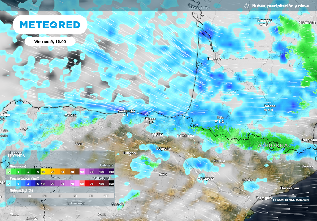 La cota de nieve pasará de 1200-1600 metros a 500-700 m en el extremo septentrional debido a la influencia del aire polar, con avisos que ya se han empezado a activar para el Pirineo occidental por nevadas. El viento del noroeste soplará con fuerza en el este, Pirineos y Baleares, con rachas de más de 80 km/h en zonas expuestas. La situación marítima estará alterada en el Cantábrico y norte de Galicia, con avisos naranjas por olas de 5-6 metros.