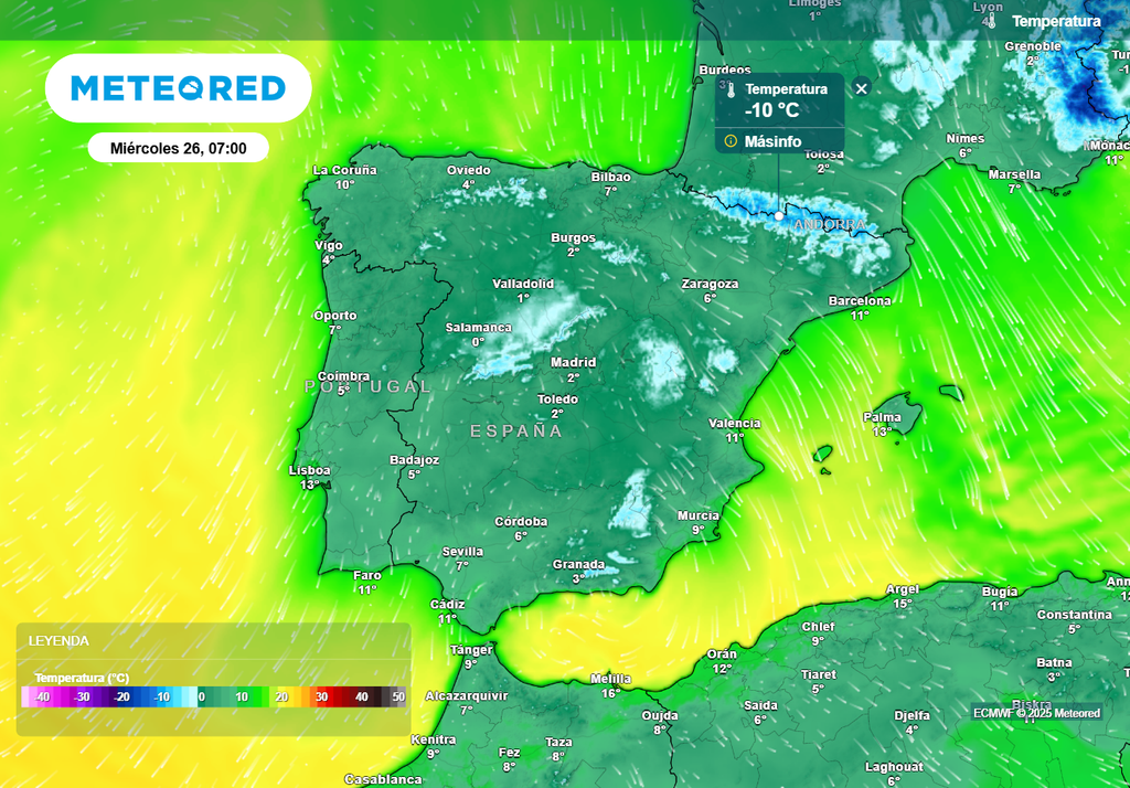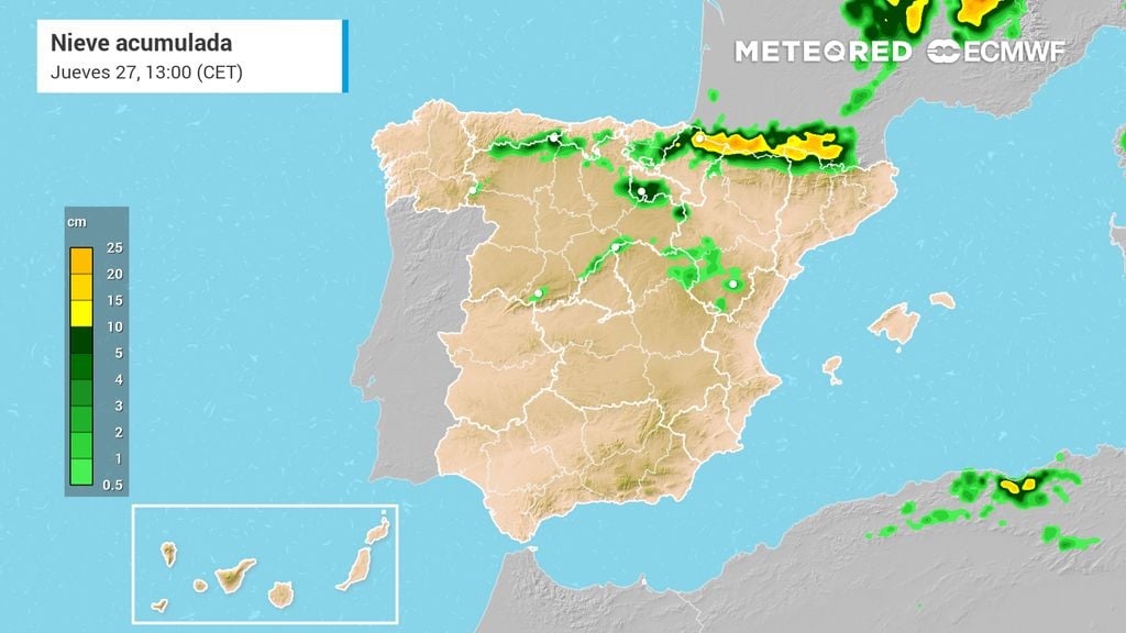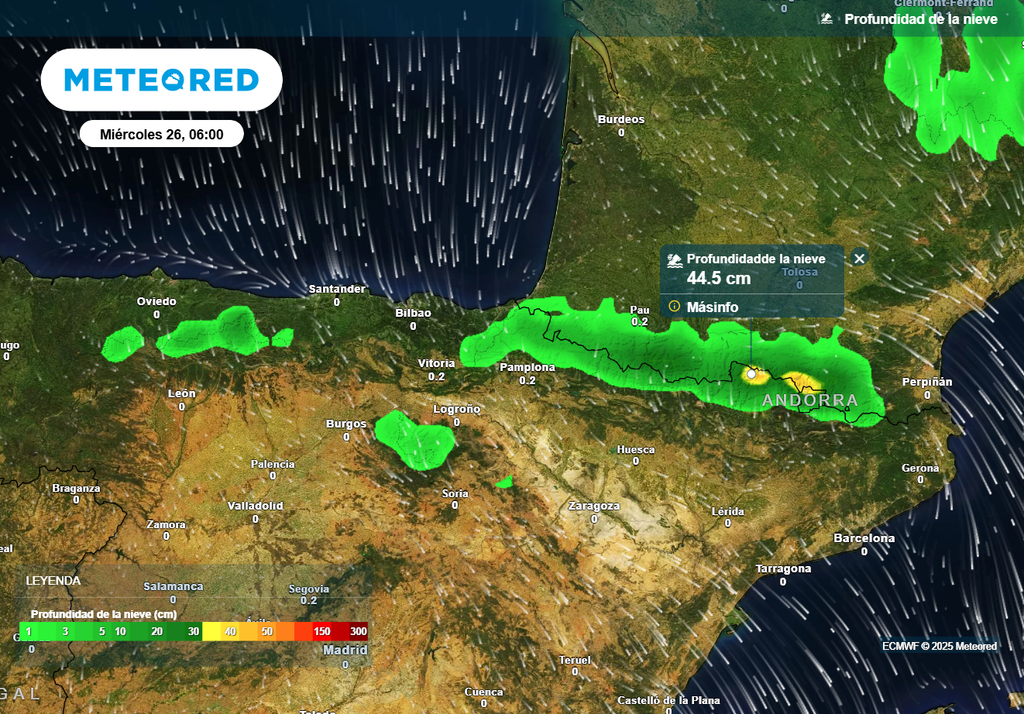Un ramal descendente del chorro polar incide sobre el tercio septentrional peninsular, lo que favorece las nevadas en la divisoria y cara norte de la Cordillera Cantábrica, Ibérico norte y Pirineo: en esta última cordillera los espesores serán importantes.