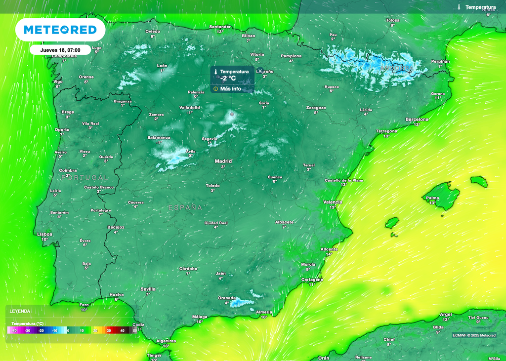 Las noches serán frías, con mínimas por debajo de los 5 ºC en la mayoría de capitales de provincia del interior y meseta norte. Aun así, las heladas quedarán relegadas a zonas de montaña la mayor parte de la semana, debido a la influencia de las nubes y el viento. Por ahora, la madrugada del jueves sería la más fría, con 3 ºC de mínima previstos en Madrid y -1 ºC en Salamanca y Valladolid.