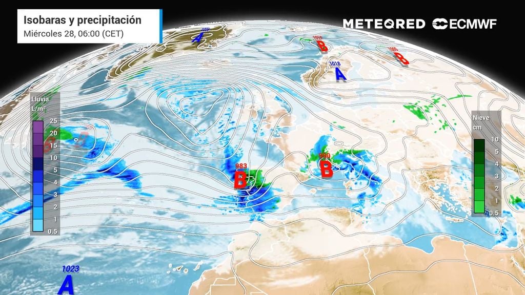 Cabe destacar que todas estas borrascas que nombramos forman parte del mismo centro de bajas presiones. Como ya explicamos en Meteored, el bloqueo entre Groenlandia y Escandinavia obliga al chorro polar a circular por latitudes más bajas de lo habitual, lo que se traduce en este desfile de sistemas frontales y depresiones. Además, un río atmosférico que arranca desde el Caribe está impactando en la Península, intensificando las precipitaciones de esta semana.