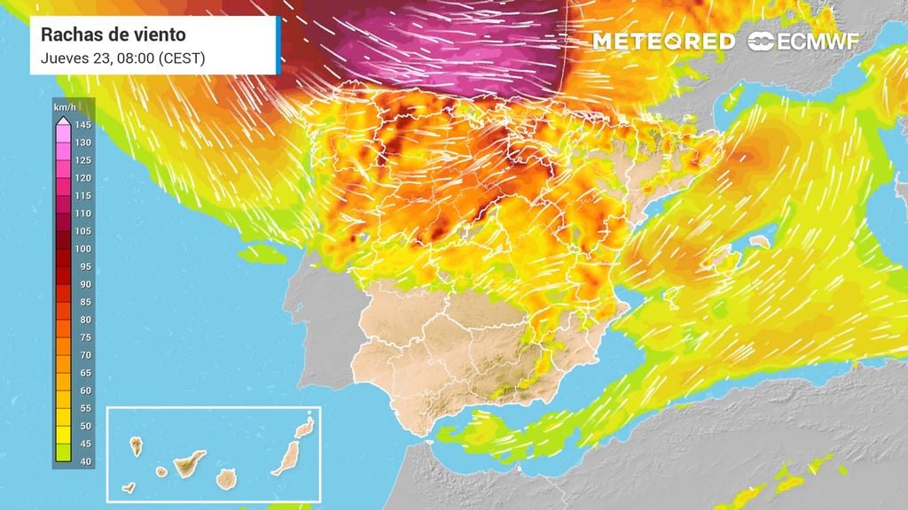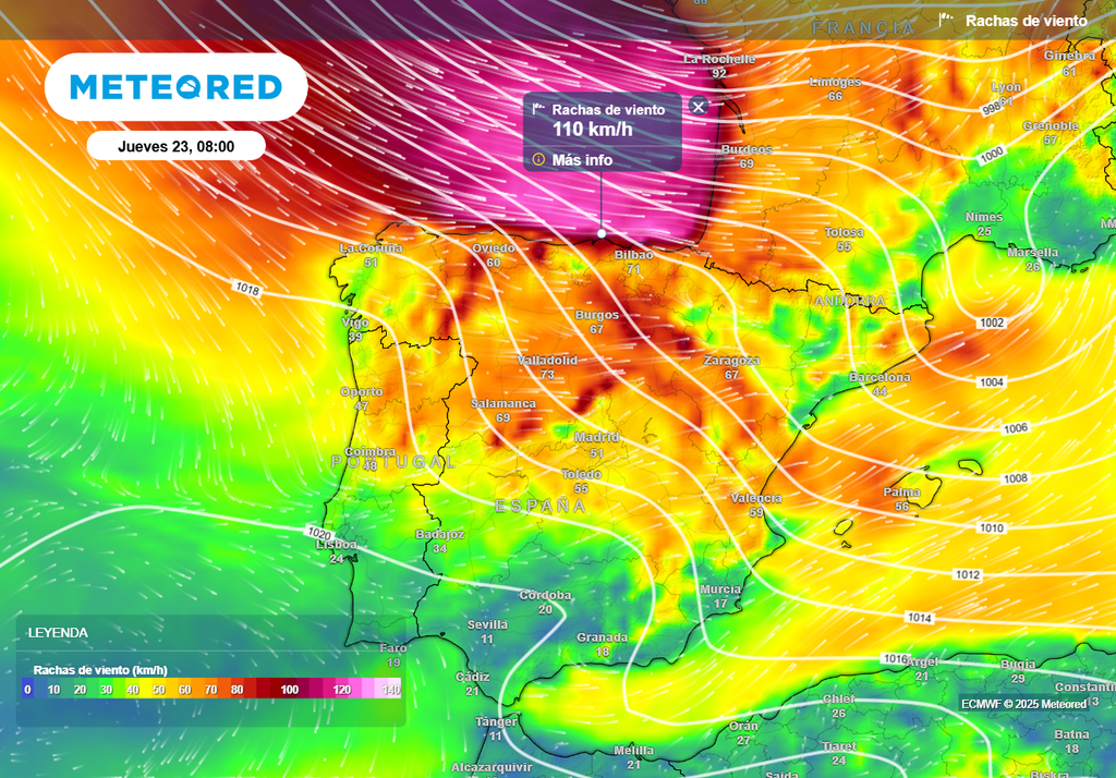 Lo más evidente de este proceso será la intensificación del viento de poniente entre hoy y mañana, activándose avisos amarillo y alguno naranja en amplias zonas del norte y este, así como en Baleares. Las rachas alcanzarán entre los 70-90 km/h, y probablemente pasarán de los 100 km/h en puntos de Galicia, Asturias, Castilla y León, Cordillera Cantábrica y bajo Ebro.