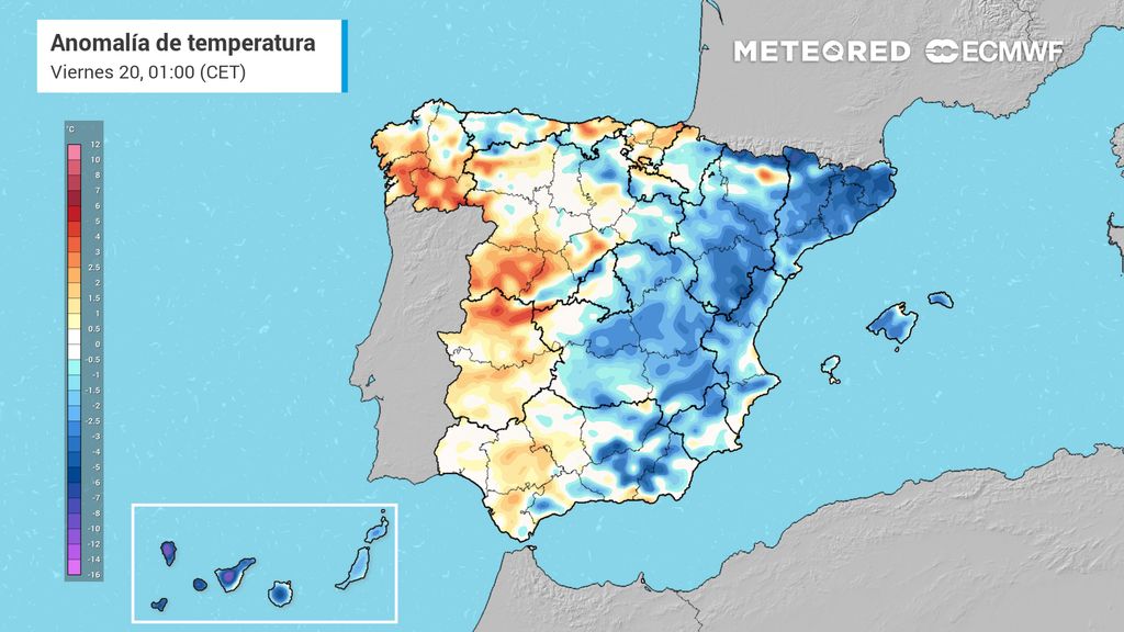 Como hemos apuntado anteriormente, las regiones que se verán más afectadas por este desplome térmico serán aquellas ubicadas o cercanas a la vertiente mediterránea, siendo la Comunidad Valenciana, Castilla-La Mancha, Cataluña, Navarra, País Vasco y Aragón las que puedan tener temperaturas diurnas 8 ºC más bajas respecto a las esperadas en el día de hoy.