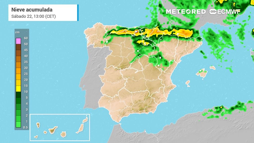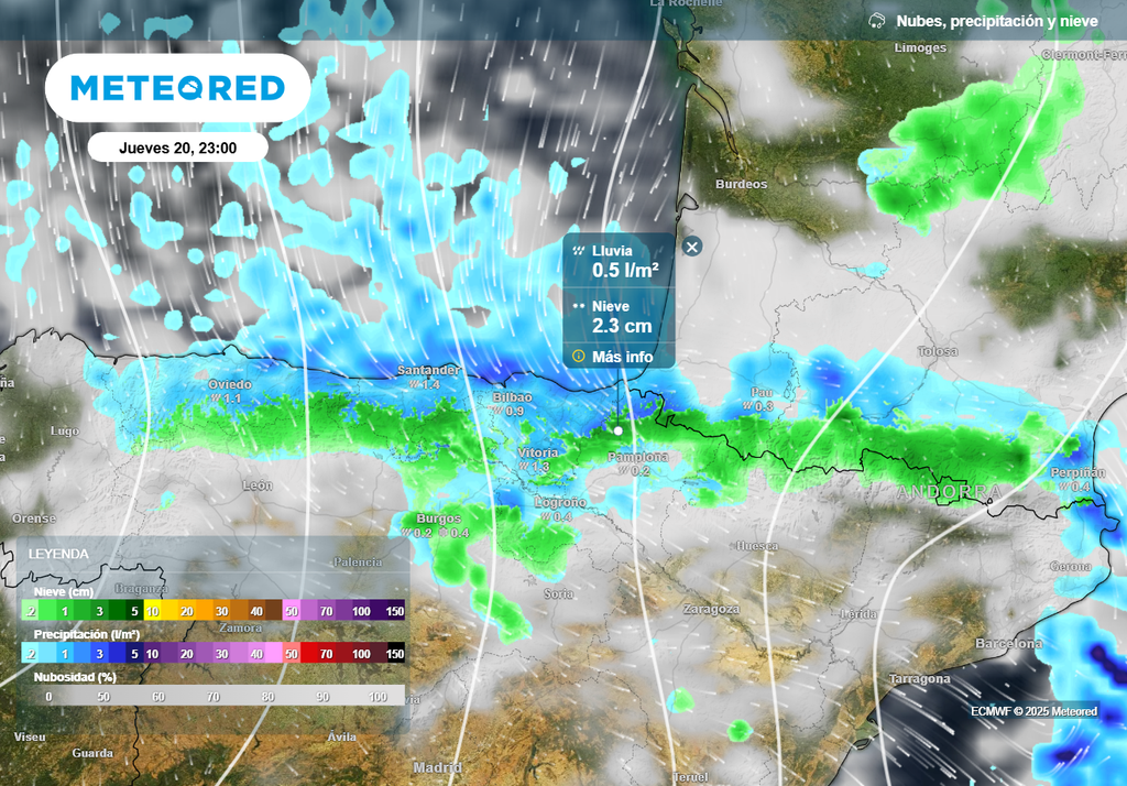 En el interior del País Vasco localmente podrían superarse los 30-40 cm en las sierras más elevadas. Hay que tener en cuenta que en muchas de estas zonas van a caer más de 100 l/m², lo que explica estos espesores. En la divisoria del Pirineo, y en concreto en los sectores oscense, navarro y leridano, pueden sumar cerca de 40-50 cm en las cumbres, aunque en esta ocasión será la vertiente francesa la que se verá más afectada por este episodio.