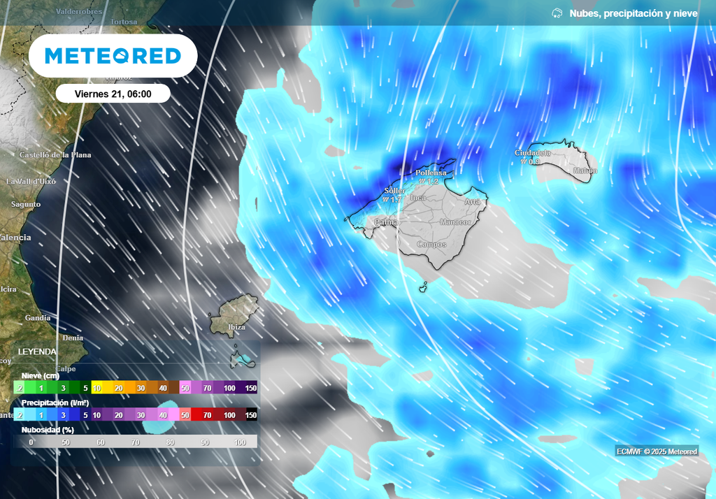 Por otra parte, tampoco habrá que perder de vista al Mediterráneo, donde se formará una borrasca que intensificará el flujo de tramontana en Baleares. Aquí también se producirá un "efecto largo" que dejará nevadas de cierta entidad en zonas altas de la serra de Tramuntana, con precipitaciones que se reactivarán principalmente en Mallorca y Menorca, donde irán localmente acompañadas de tormenta.