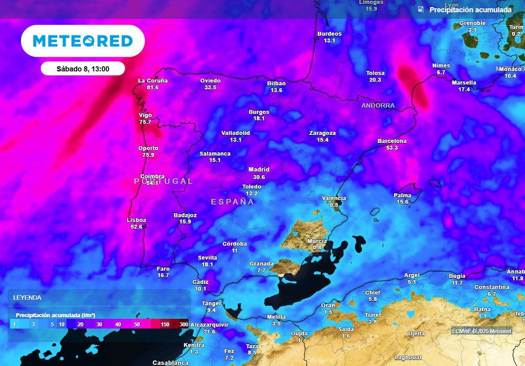 Según el modelo europeo, se acumularán más de 150 l/m² en el oeste de Pontevedra y Coruña esta semana, superándose ampliamente los 50 l/m² en el oeste del Sistema Central, amplias zonas de Galicia, entorno del lago de Sanabria, cara sur del Pirineo, Cataluña y Baleares. Puntualmente pasarán de los 100 l/m² en los sectores más expuestos. El litoral sureste se quedará al margen.