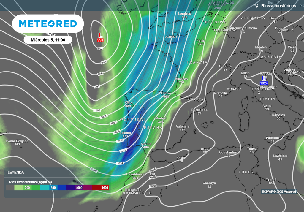 Los modelos muestran que el sistema frontal cruzará la Península de oeste a este. Como ya anticipamos en Meteored, se verá reforzado por una vaguada en altura y por un río de humedad que llegará desde el Atlántico. Los mapas muestran lluvias intensas en Galicia, extendiéndose a Castilla y León, Extremadura, comunidades cantábricas, extremo occidental de Castilla-La Mancha y oeste de Andalucía en la jornada del miércoles.