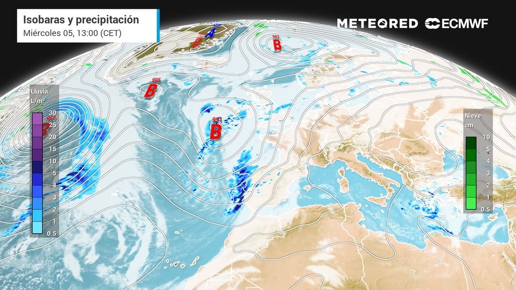La circulación atlántica se mantendrá en lo que queda de semana, dando lugar a un tren de frentes que dejarán precipitaciones en la mayor parte de España: en algunas zonas caerán más de 100 l/m².