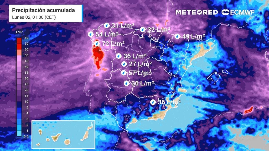 El frente del domingo y lunes podría dejar más de 50 l/m2 en media España