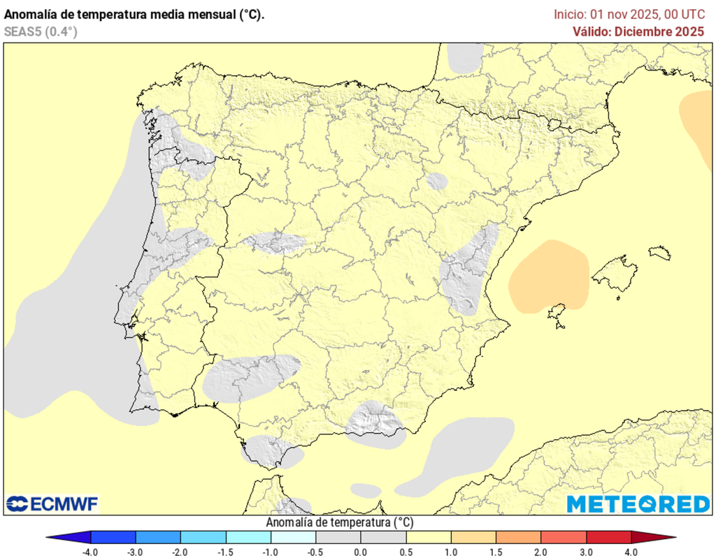 Las primeras tendencias del modelo europeo muestran que en zonas del tercio septentrional peninsular las temperaturas podrían situarse entre 1 y 3 ºC por encima de los valores medios de la primera quincena de diciembre. En el resto, las anomalías pueden ser más moderadas, e incluso no se atisban desviaciones significativas respecto al promedio en Andalucía, sur de Castilla-La Mancha, Región de Murcia y Canarias.