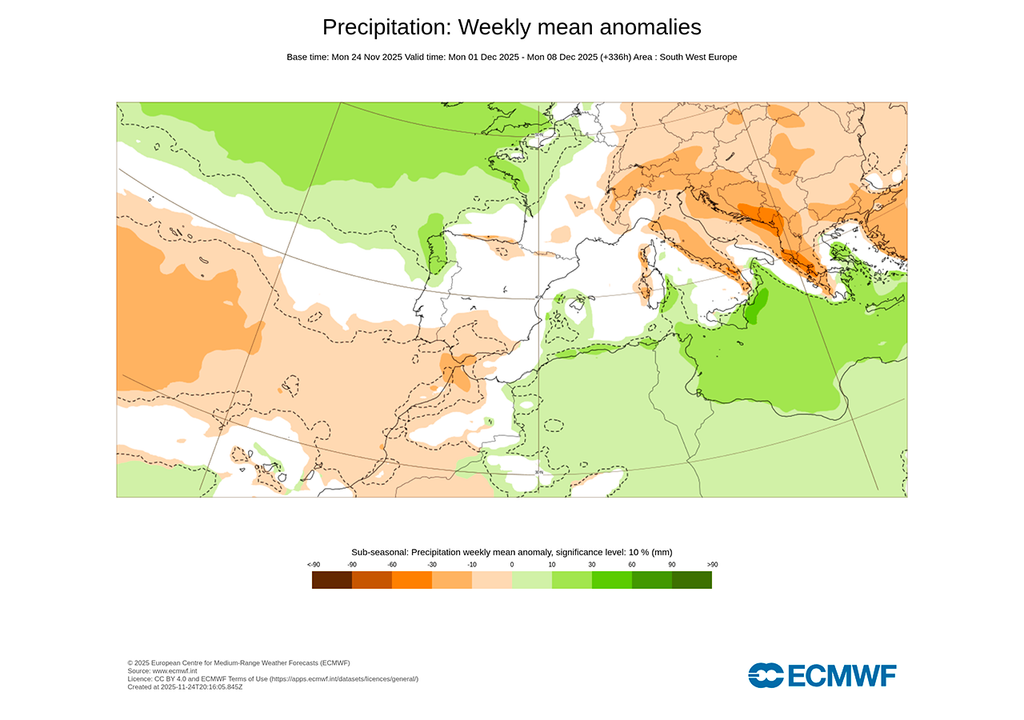 En cambio, para el resto el modelo europeo de momento no muestra una tendencia clara, con lluvias que podrían ser más escasas de lo habitual en el entorno del Estrecho. En la segunda quincena podrían predominar las condiciones anticiclónicas, con pequeñas señales de anomalías húmedas en la costa mediterránea, archipiélago canario y Galicia.