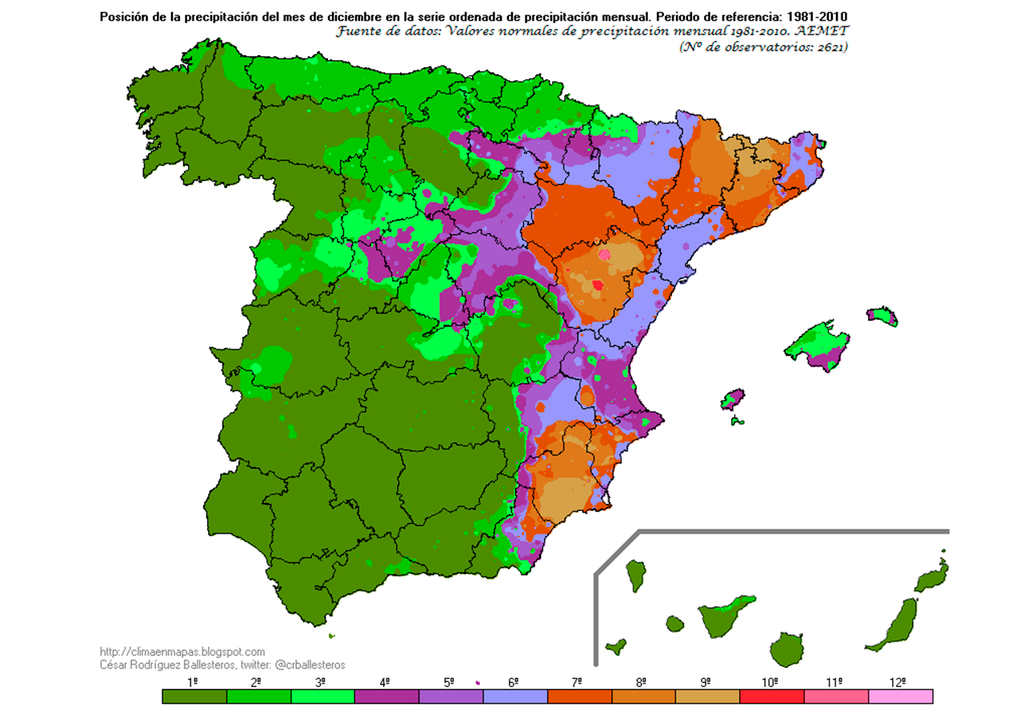 Es uno de los meses más lluviosos en el conjunto anual en gran parte de nuestro territorio, ocupando el primer lugar en gran parte de la vertiente atlántica, Galicia y en gran parte de Canarias. En el oeste de la comunidad gallega, otros puntos aislados del noroeste, Grazalema, sector de Gredos, interior de La Palma y en el Cantábrico oriental la precipitación media supera los 200 l/m². Por contra, diciembre suele ser bastante seco en la costa mediterránea y en el valle del Ebro.