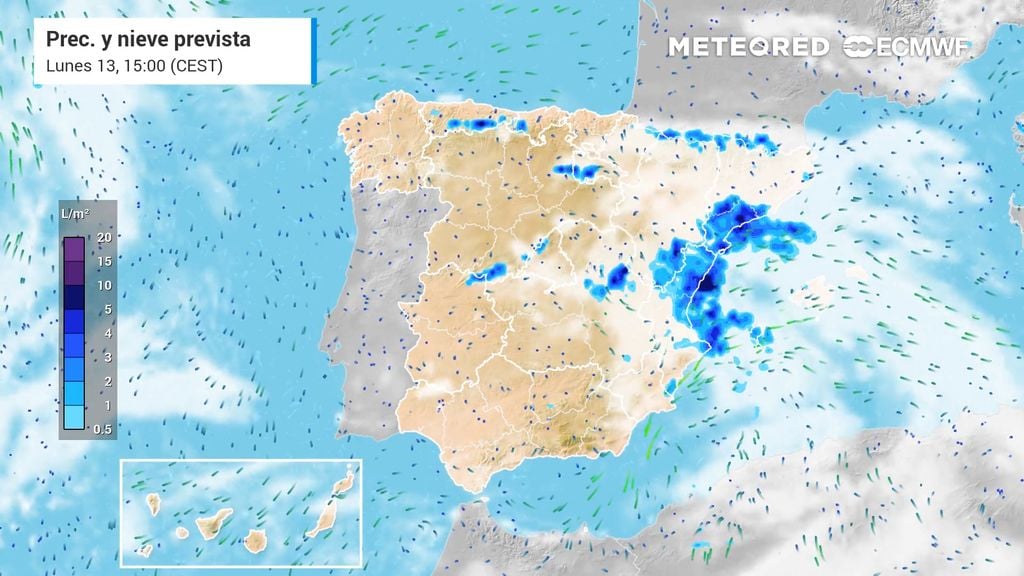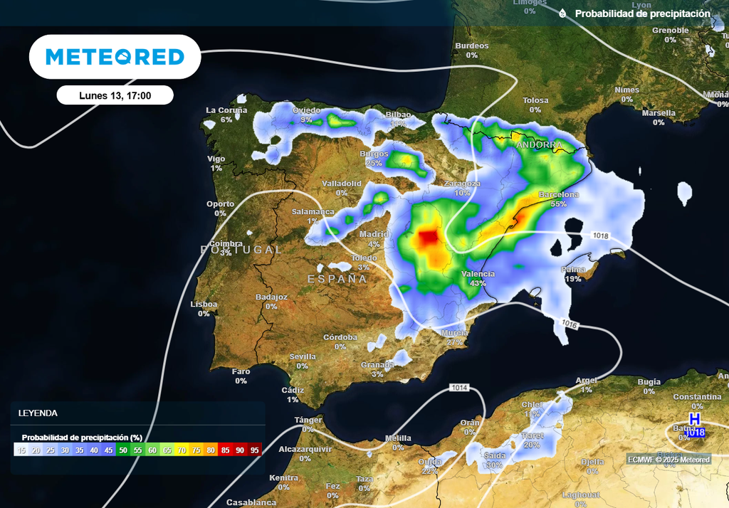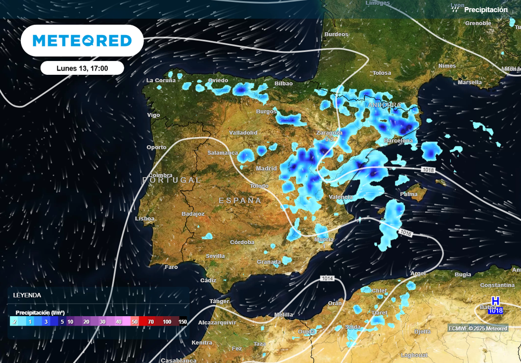 Por lo tanto, la distribución de las lluvias este lunes será más dispersa, pero se seguirán produciendo tormentas localmente fuertes, especialmente en entornos de montaña y áreas del este y centro peninsular.