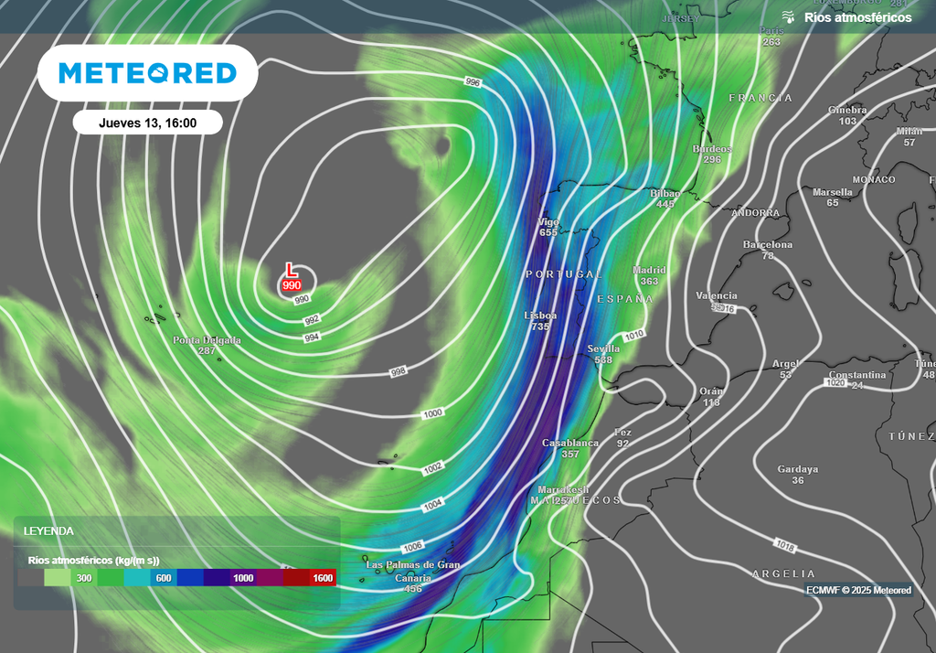 El río atmosférico llegará impulsado por un potente flujo del sur-suroeste, con origen al sur del archipiélago canario. Este corredor de humedad impactará directamente en la fachada atlántica peninsular, estableciendo una conexión continua entre las masas de aire templado africanas y la península ibérica.