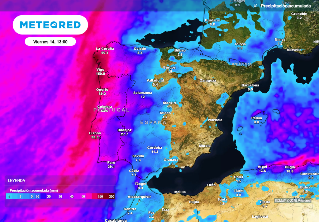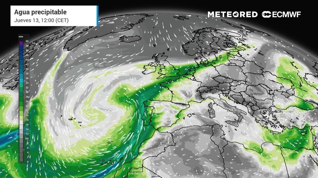 El resultado será un patrón muy dinámico, con un flujo meridional persistente que transportará aire subtropical desde el Atlántico tropical y el norte de África hacia la península ibérica, reforzando el aporte continuo de humedad.