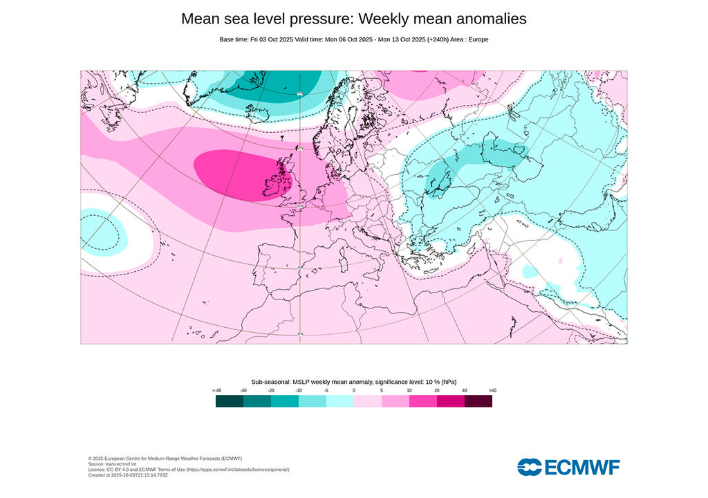 En este comienzo de octubre la situación meteorológica del Atlántico norte estará dominada por la circulación de borrascas muy profundas (Amy o exImelda, entre otras) en latitudes altas, con un chorro polar bastante intenso. Se trata de un típico patrón de NAO+, lo que se suele traducir en un tiempo generalmente suave y estable en casi toda España.