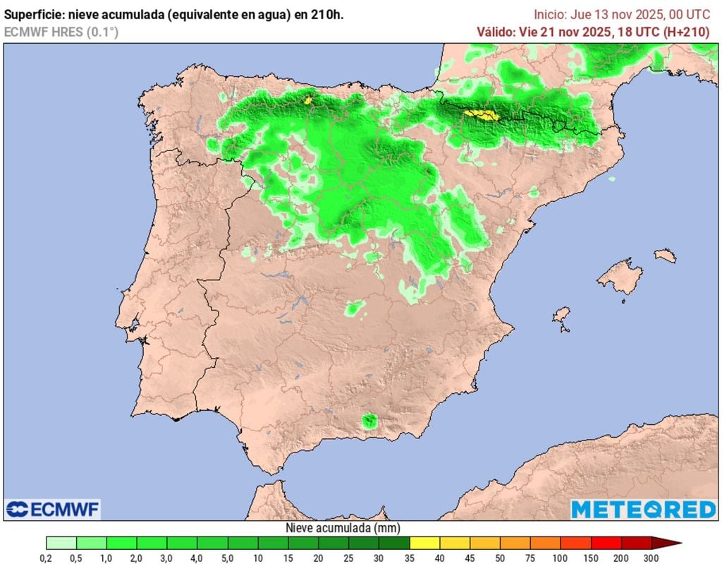 Las nevadas más copiosas se producirían en la Cordillera Cantábrica y Pirineos, con espesores de 20 a 40 cm en pocos días, con una nevada generalizada que afectaría a ambas vertientes (norte y sur). En el Sistema Central y Sistema Ibérico el modelo europeo anticipa acumulados de 5 a 15 cm, pero pueden variar en próximas salidas.