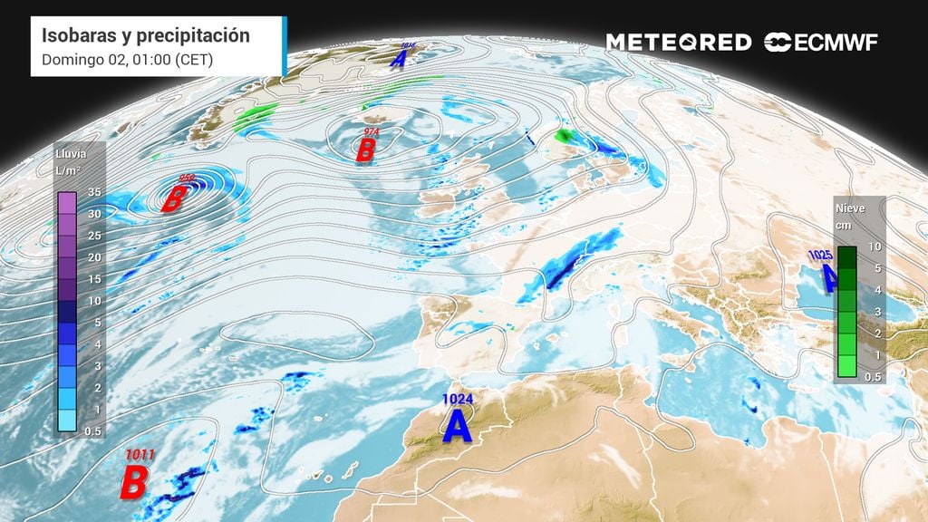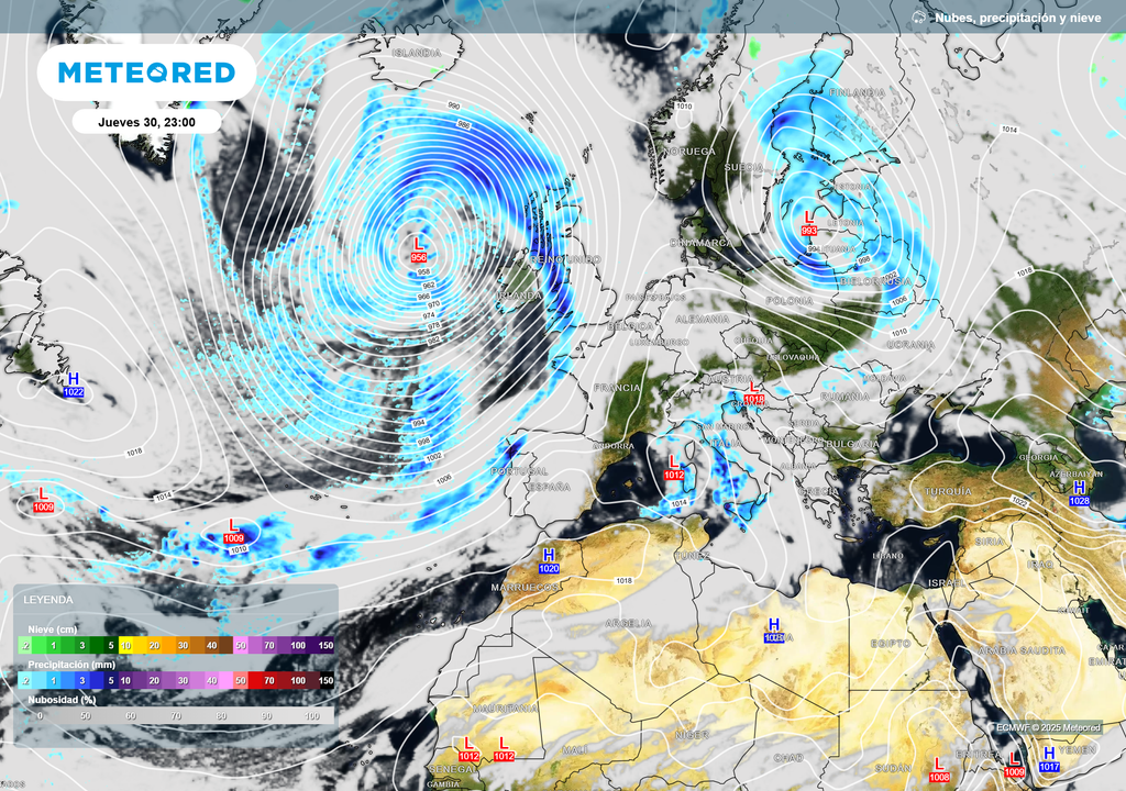De cara a las próximas jornadas, los modelos ya muestran el acercamiento de una nueva y profundísima borrasca procedente del Atlántico a nuestra geografía. En este caso, su centro se posicionará al este de las islas británicas pero los frentes asociados a ella dejarán episodios de lluvia en España.