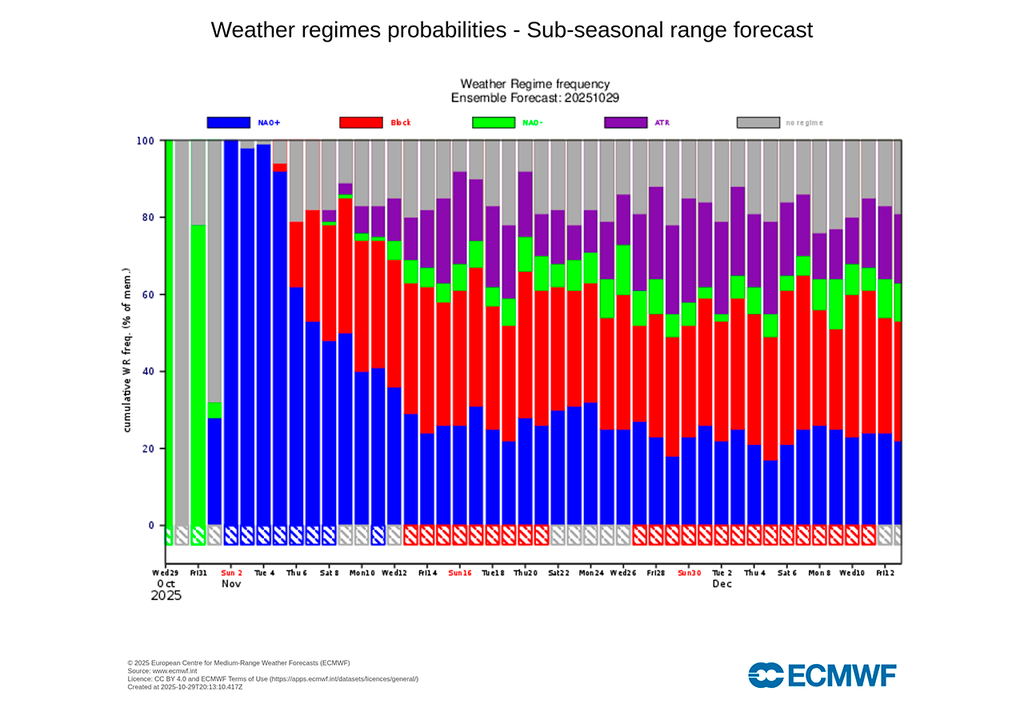 Tal y como indican las previsiones más recientes del modelo europeo, el índice NAO permanecerá en fase negativa hasta aproximadamente el 2 de noviembre. A partir de esa fecha, el índice comenzará a repuntar hacia valores positivos, que sugiere un cambio en el patrón atmosférico. El modelo europeo no descarta la formación de un bloqueo en Centroeuropa, dificultando la llegada de las lluvias en la primera mitad de la semana que viene.