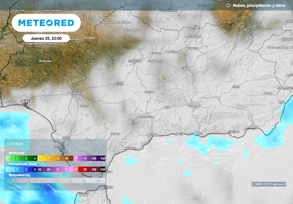En la primera mitad del día no se esperan lluvias, tan solo el tránsito de nubes medias y altas que taparán el sol de manera gradual. Durante la tarde se activarán precipitaciones en Alborán, que afectarán únicamente al litoral. Se prevén apenas un par de litros a lo sumo en las costas de Málaga, Granada y Almería. En el resto, de momento no se prevén lluvias en el Día de Navidad.