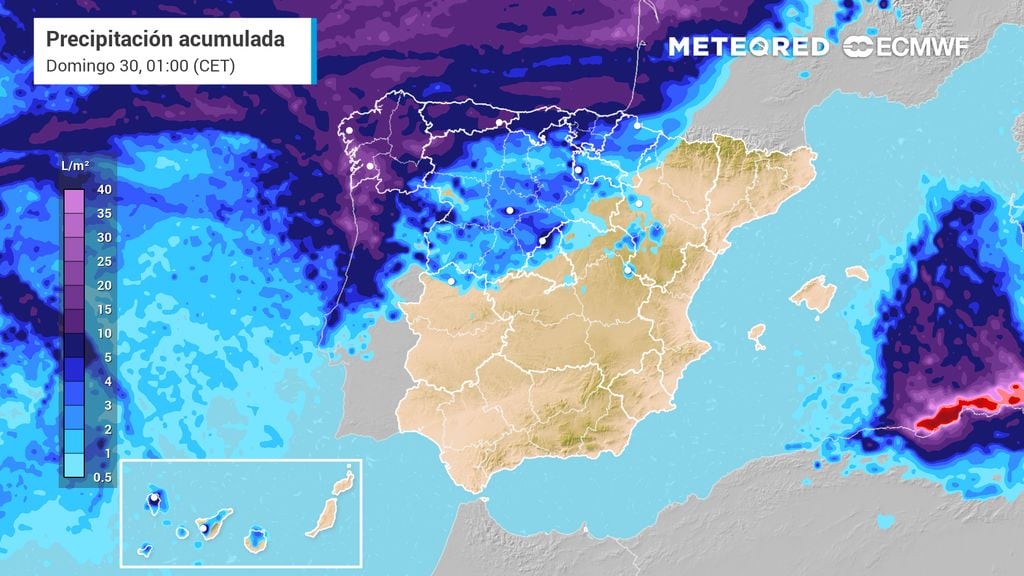 En Galicia comenzará a llover ya en la noche del viernes, pero las precipitaciones ganarán intensidad durante la mañana del sábado, pudiendo ser localmente fuertes en las horas centrales. Por la tarde recorrerán gran parte del cuadrante noroeste peninsular, con algunas nevadas en las sierras. En la madrugada y mañana del domingo las precipitaciones darán el salto al Mediterráneo.