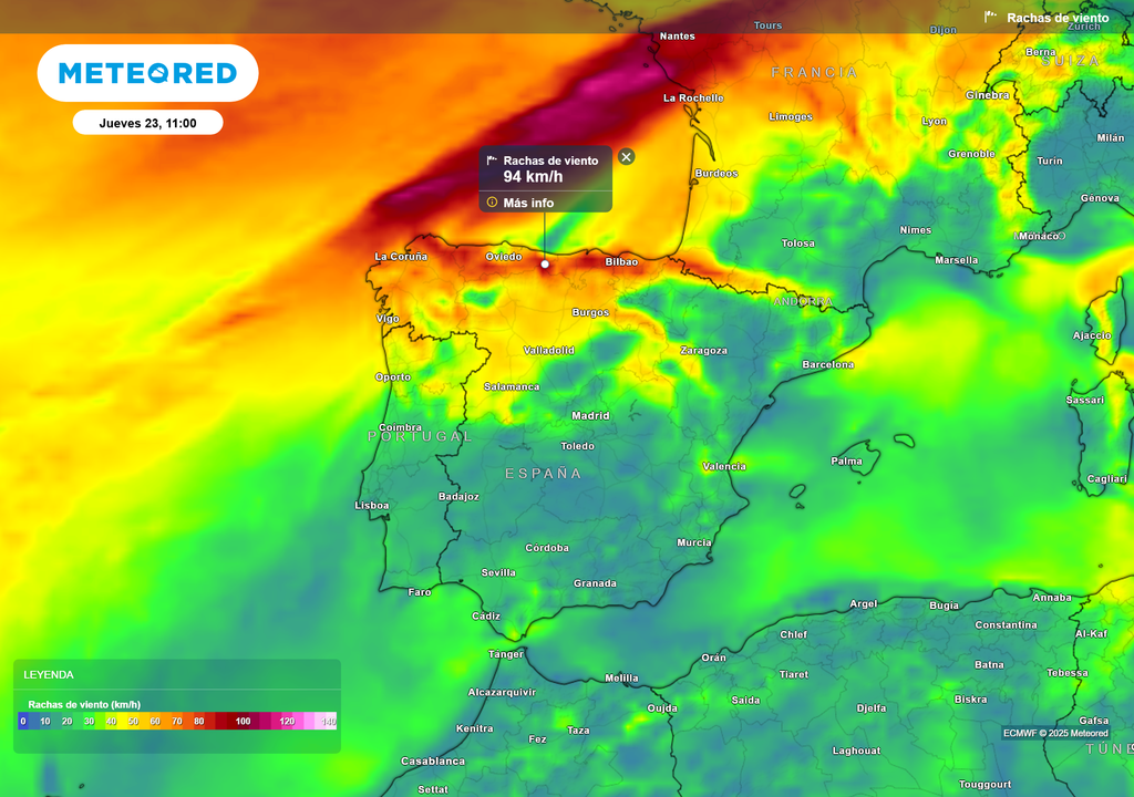 A partir del jueves, con el debilitamiento de la circulación atlántica, el viento tenderá a amainar en la mayoría de las regiones, aunque podría reforzarse puntualmente en el litoral cantábrico debido a la proximidad de estas regiones a la profunda baja europea