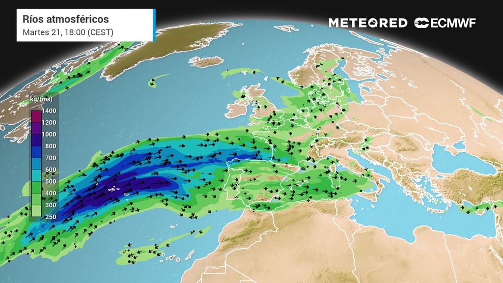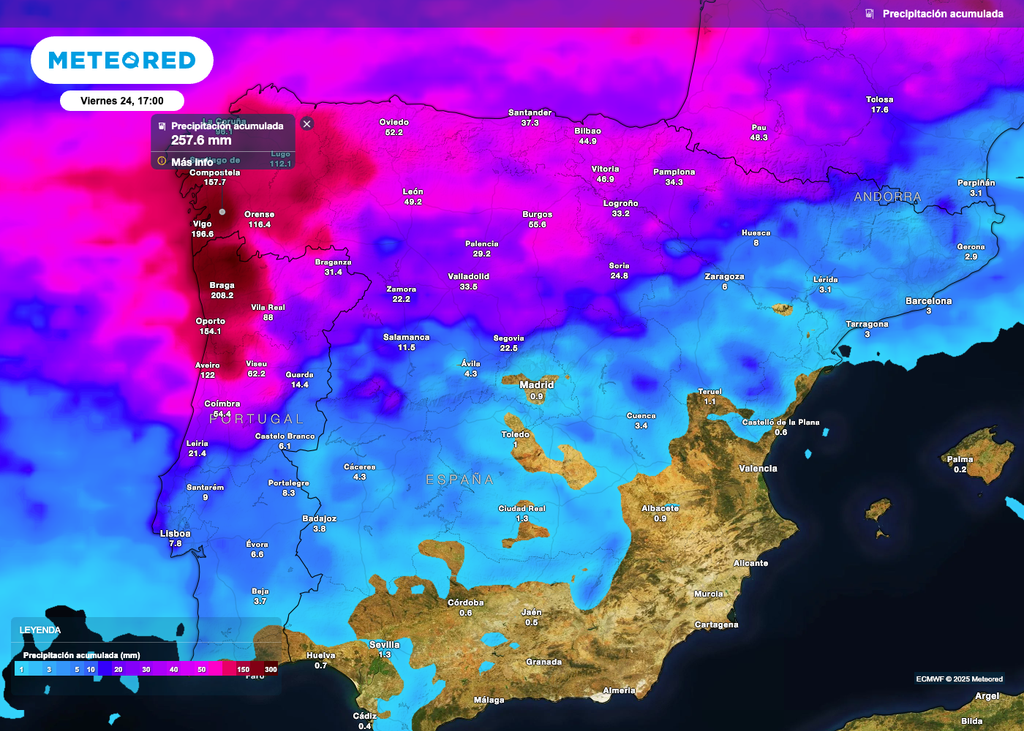 Un río atmosférico de humedad subtropical, eficiente y bien estructurado, que atraviesa el Atlántico sur y alcanzará directamente el noroeste peninsular. Este flujo de vapor de agua, canalizado por la intensa circulación del oeste, impactará de lleno en las costas gallegas, donde se espera que deje registros superiores a los 200 l/m² a lo largo de la semana.