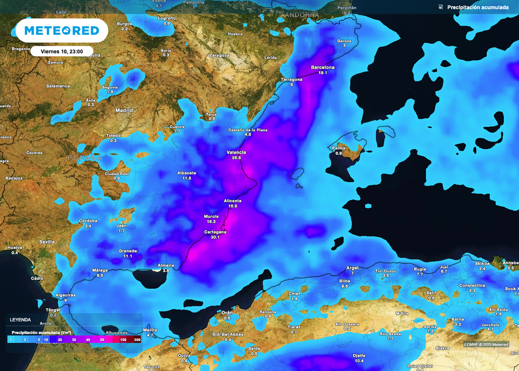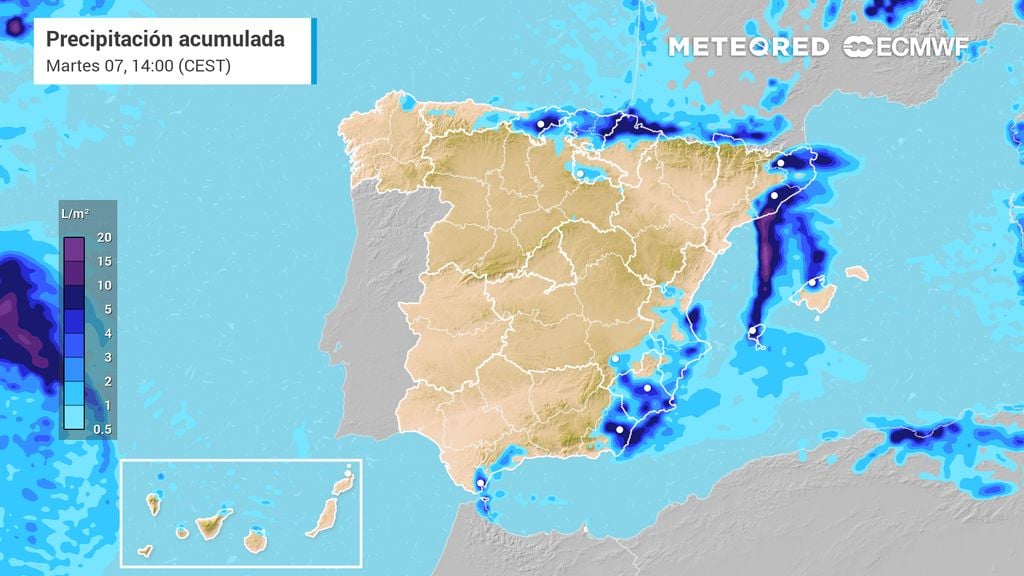 La inestabilidad arrancará el miércoles en forma de chubascos en el interior sureste, Sistema Central y lluvias débiles en el Cantábrico y norte de Galicia. El jueves se intensificarían las lluvias en todo el arco Mediterráneo, con acumulados de 10 a 20 l/m2 en la Región de Murcia, Comunidad Valenciana, extremo este de Castilla La Mancha, Sierras de Almería y Cataluña. La envergadura de las precipitaciones no está clara todavía y dependerá de si finalmente se forma una DANA o una vaguada.