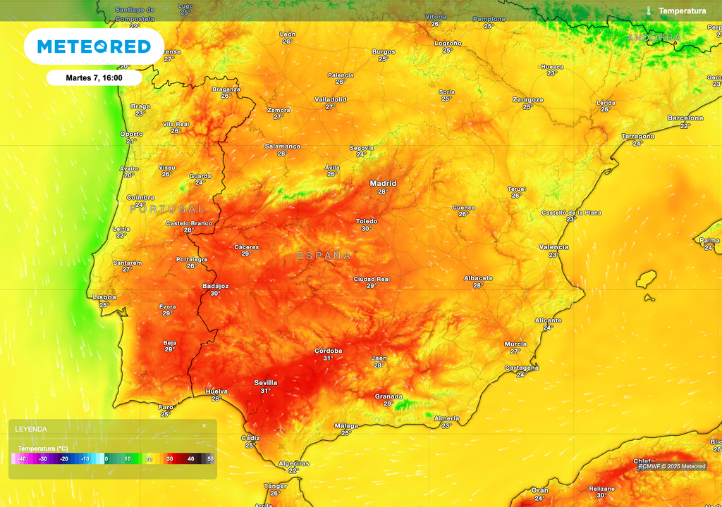 Lo que parecía una semana con temperaturas significativamente altas, quedará muy rebajado por las lluvias en el este. Las temperaturas más altas se darán en el cuadrante suroeste, con máximas de 30 a 32 ºC en los valles del Tajo, Guadiana y Guadalquivir hasta el martes.