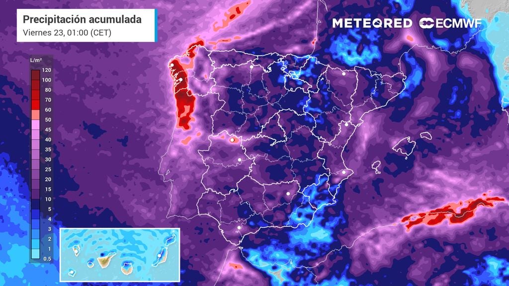 Las precipitaciones serán muy abundantes en la vertiente atlántica, superando holgadamente las tres cifras en algunas comunidades, sumándose a los ya abultados registros acumulados en el año hidrológico actual. El balance pluviométrico no solo es excelente, sino equilibrado entre las vertientes mediterránea y atlántica debido a una alternancia de situaciones de levantes y ponientes.