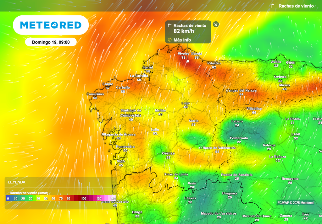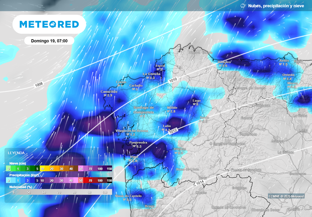 Según el modelo europeo, el domingo podrían caer entre 30 y 40 l/m2 en el litoral oeste de A Coruña y Pontevedra, especialmente en las Rías Baixas. Los acumulados de precipitación irán a menos hacia el interior y oeste, con apenas 5 a 10 l/m2 previstos en el oeste de Ourense y Lugo. Durante la mañana, las rachas del suroeste superarán los 70 km/h en los litorales de A Coruña y Pontevedra, debilitándose hacia el interior (50-60 km/h).
