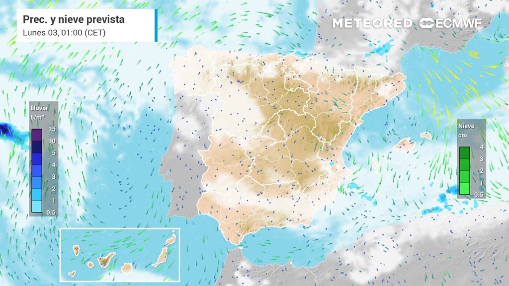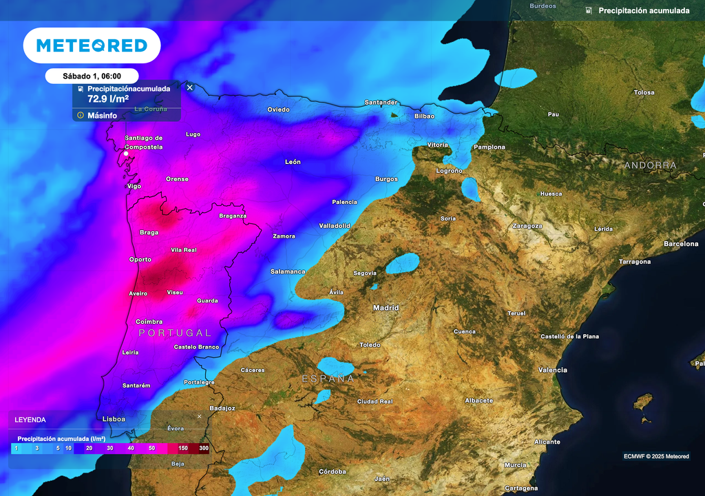 Hasta ahora las lluvias más abundantes en España han caído en Galicia, con más de 50 l/m2 registrados en A Cañiza (Pontevedra) y Casas do Porto (A Coruña), según la AEMET. Las rachas de viento han superado los 90 km/h en cabos y cumbres de Asturias y Cantabria, con un registro de hasta 115 km/h en Vega de Ario (Asturias).