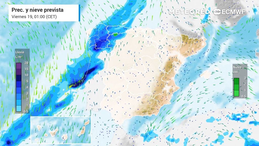En lo que queda de semana se acumularán 50 l/m² o más en la Comunidad Valenciana (incluso se puede llegar a esta cifra ya en el día de hoy en algunos municipios), oeste de Galicia, sector más occidental del Sistema Central (entre el norte de Extremadura y el sur de Salamanca), cara sur de la Cordillera Cantábrica leonesa, valles y macizos del sur del Pirineo oscense y puntos de Canarias. No descartamos que se alcancen o superen en Cataluña.