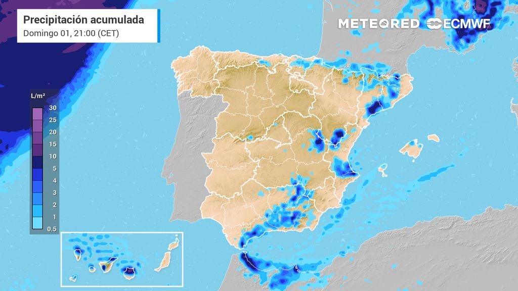 Las provincias con mayor probabilidad de precipitaciones serán Granada, Jaén, Albacete, Cuenca, Teruel e interior de Castellón, donde podrán registrarse tormentas localmente intensas y acompañadas de actividad eléctrica. Algunos de los núcleos más organizados pueden dejar acumulados de más de 10-20 l/m², incluso pueden superarse los 30-40 l/m² de forma local. Mañana la inestabilidad decrecerá, a la espera de un cambio de tiempo mucho más importante desde el lunes.